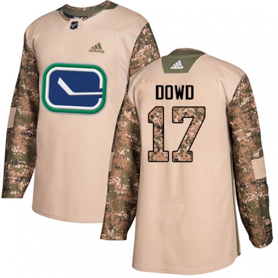 >Men's Adidas Vancouver Canucks #17 Nic Dowd Authentic Camo Veterans Day Practice NHL Jersey