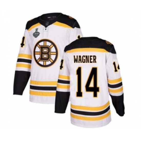 >Men's Boston Bruins #14 Chris Wagner Authentic White Away 2019 Stanley Cup Final Bound Hockey Jersey