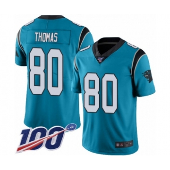 >Men's Carolina Panthers #80 Ian Thomas Limited Blue Rush Vapor Untouchable 100th Season Football Jersey