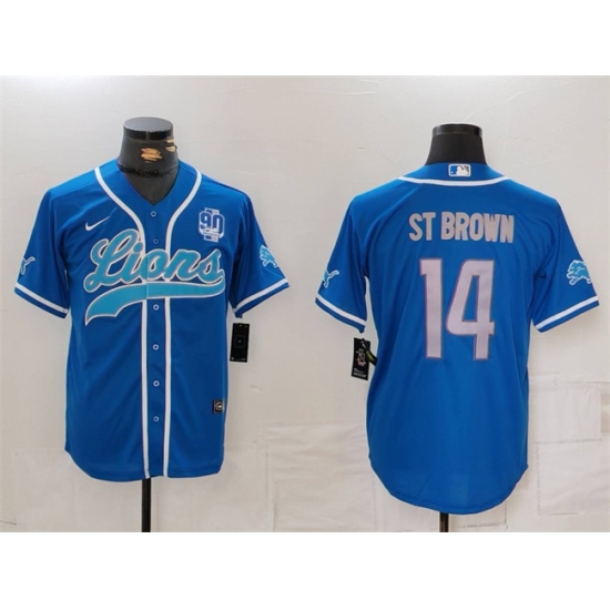 >Men's Detroit Lions #14 Amon-Ra St. Brown Blue With 90th Anniversary Cool Base Stitched Baseball Jersey