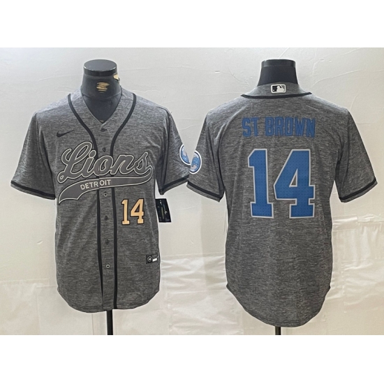 >Men's Detroit Lions #14 Amon-Ra St. Brown Number Gray Cool Base Stitched Baseball Jersey