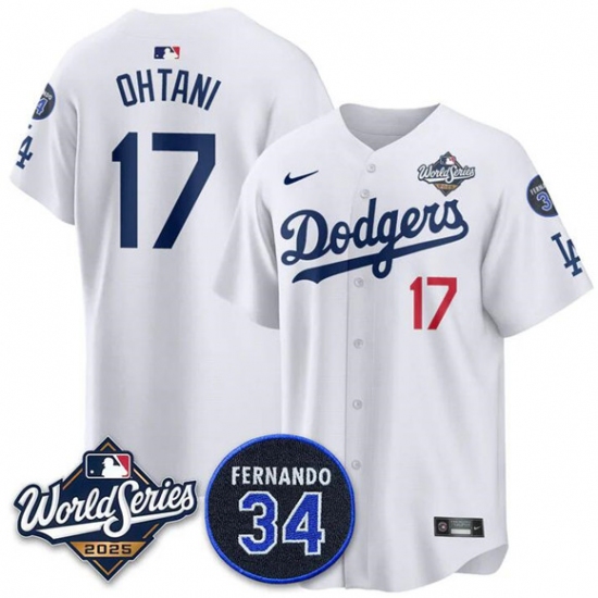 Men's Los Angeles Dodgers #17 Shohei Ohtani White 2025 World Series With No. 34 Limited Stitched Jersey