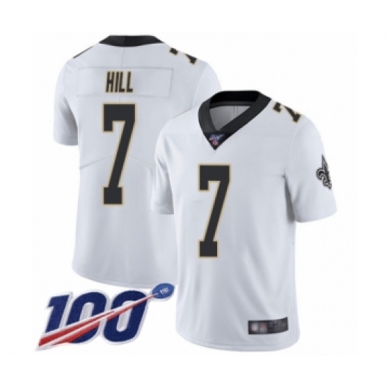 >Men's New Orleans Saints #7 Taysom Hill White Vapor Untouchable Limited Player 100th Season Football Jersey