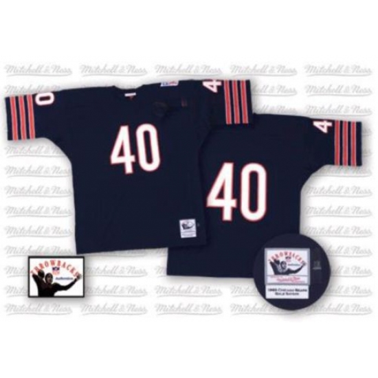 Feel like part of your favorite team by wearing this NFL® Mitchell And Ness Chicago Bears #40 Gale Sayers Authentic Jersey Blue Team Color With Small Number Authentic Throwback NFL Jersey, made of thick, high-quality Pro-Brite fabric for a genuine gridiron look. The players number which 100% stitched is displayed in tackle twill on the chest, back and sleeves, along with the team name on the front. The players name which 100% stitched is displayed on a sewn-down nameplate at the back. 100% Pro-Brite nylon and 100% Pro-Brite polyester for body, 100% lycratalic spandex dazzle for Side Panels/Collar/Cuffs, NFL® Equipment patch sewn on the bottom of the front collar or fabric insert, NFL® Equipment jock tag with numeric sizing is applied to the lower left bottom of the jersey, Officially licensed