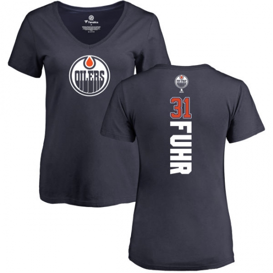 >NHL Women's Adidas Edmonton Oilers #31 Grant Fuhr Navy Blue Backer Slim Fit V-Neck T-Shirt