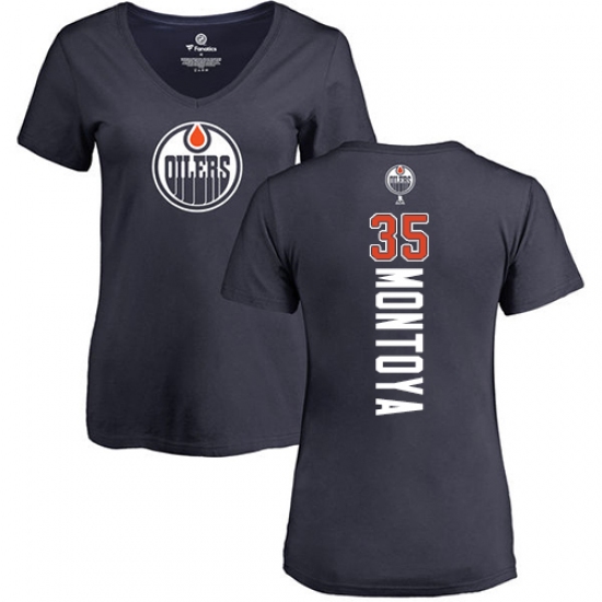 >NHL Women's Adidas Edmonton Oilers #35 Al Montoya Navy Blue Backer Slim Fit V-Neck T-Shirt