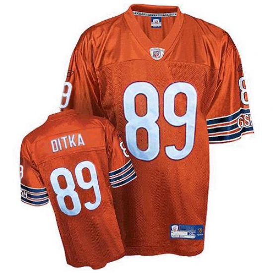The Reebok Chicago Bears #89 Mike Ditka Replica Jersey Orange Replica NFL Alternate Jersey by Reebok® is made with quick-drying nylon mesh and designed with screen-printed player and team graphics on the chest, back, sleeves and shoulders. 100% polyester diamond back mesh body, Polyester dazzle sleeves and yoke, Player's number screen-printed on the chest, back and sleeves, Player's name screen-printed at the upper back on a sewn down nameplate, Flat-knit collar with NFL® Equipment patch sewn at the point in the front, Woven jock tag shown at lower left front above the hem, Decorated in the team colors, Officially licensed