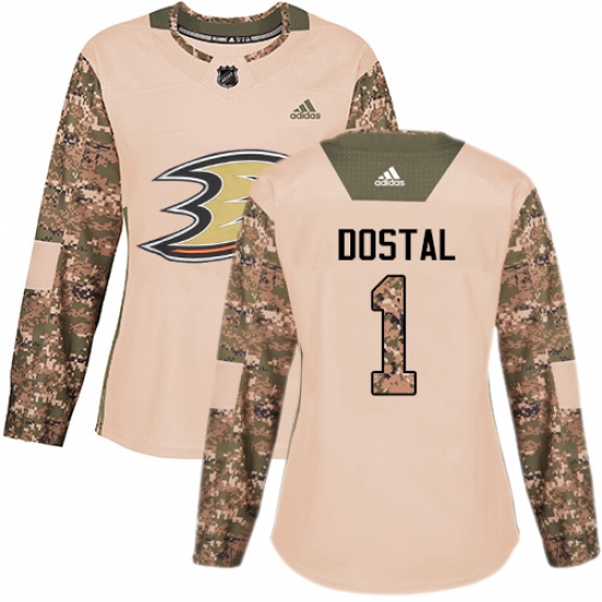 Women's Adidas Anaheim Ducks #1 Lukas Dostal Authentic Camo Veterans Day Practice NHL Jersey