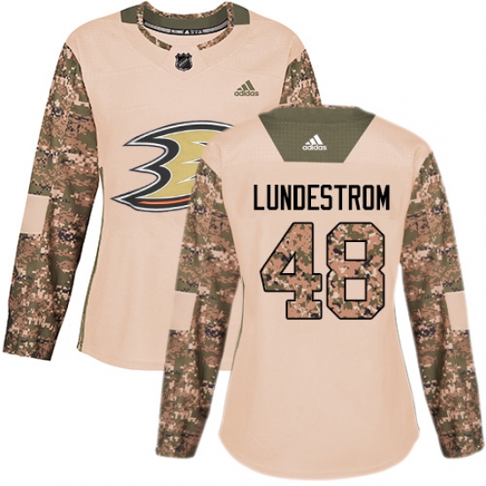 >Women's Adidas Anaheim Ducks #48 Isac Lundestrom Authentic Camo Veterans Day Practice NHL Jersey