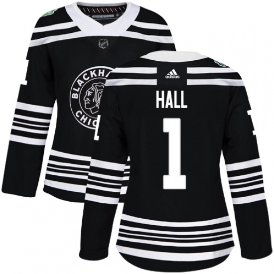 >Women's Adidas Chicago Blackhawks #1 Glenn Hall Authentic Black 2019 Winter Classic NHL Jersey