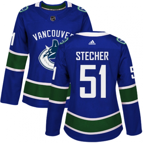 Home>NHL>Vancouver Canucks>Troy Stecher>Women's Adidas Vancouver Canucks #51 Troy Stecher Premier Blue Home NHL Jersey