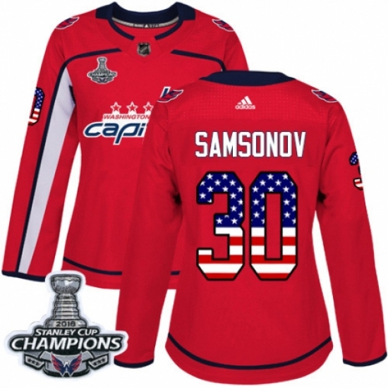 >Women's Adidas Washington Capitals #30 Ilya Samsonov Authentic Red USA Flag Fashion 2018 Stanley Cup Final Champions NHL Jersey
