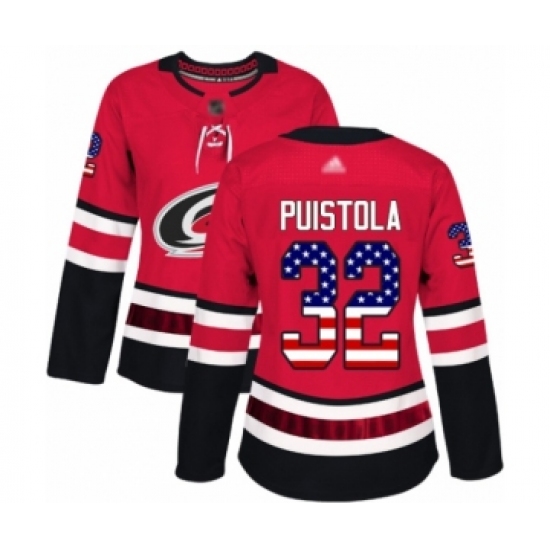 >Women's Carolina Hurricanes #32 Patrik Puistola Authentic Red USA Flag Fashion Hockey Jersey