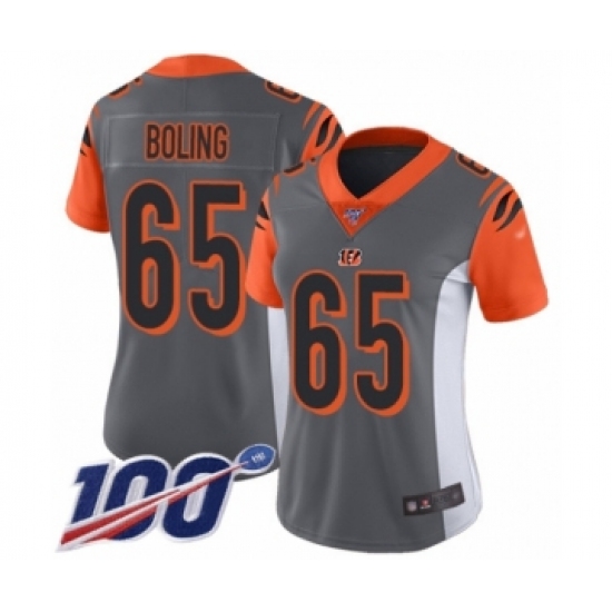 >Women's Cincinnati Bengals #65 Clint Boling Limited Silver Inverted Legend 100th Season Football Jersey