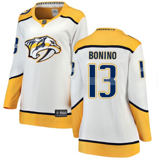 Home>NHL>Nashville Predators>Nick Bonino>Women's Nashville Predators #13 Nick Bonino Fanatics Branded White Away Breakaway NHL Jersey