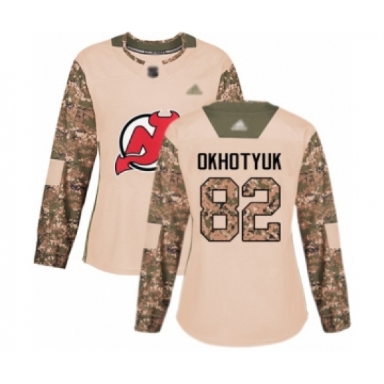 >Women's New Jersey Devils #82 Nikita Okhotyuk Authentic Camo Veterans Day Practice Hockey Jersey