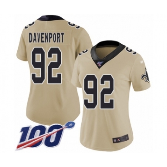 >Women's New Orleans Saints #92 Marcus Davenport Limited Gold Inverted Legend 100th Season Football Jersey