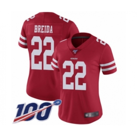 Women's San Francisco 49ers #22 Matt Breida Red Team Color Vapor Untouchable Limited Player 100th Season Football Jersey