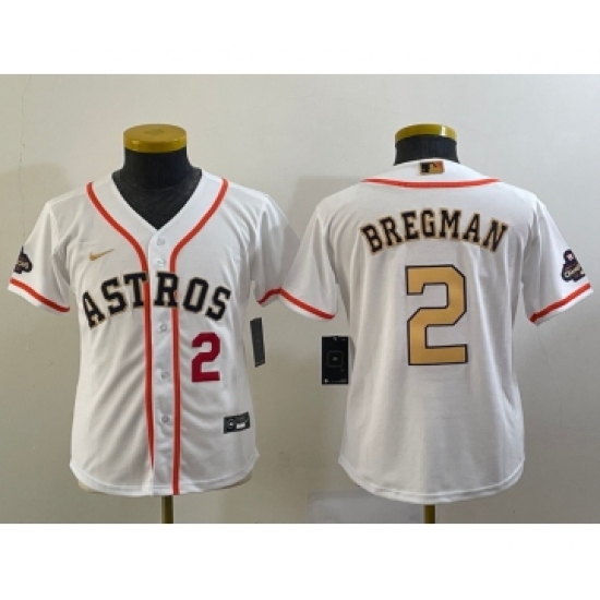 Youth Houston Astros #2 Alex Bregman Number 2023 White Gold World Serise Champions Cool Base Stitched Jersey