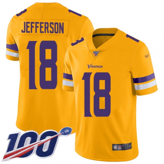 Youth Minnesota Vikings #18 Justin Jefferson Gold Stitched NFL Limited Inverted Legend 100th Season Jersey