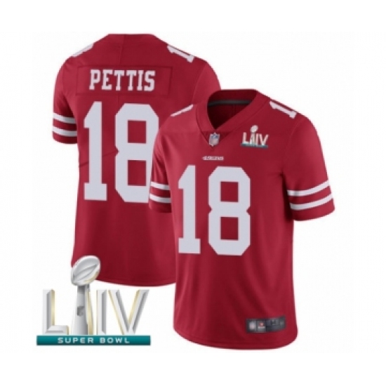 >Youth San Francisco 49ers #18 Dante Pettis Red Team Color Vapor Untouchable Limited Player Super Bowl LIV Bound Football Jersey